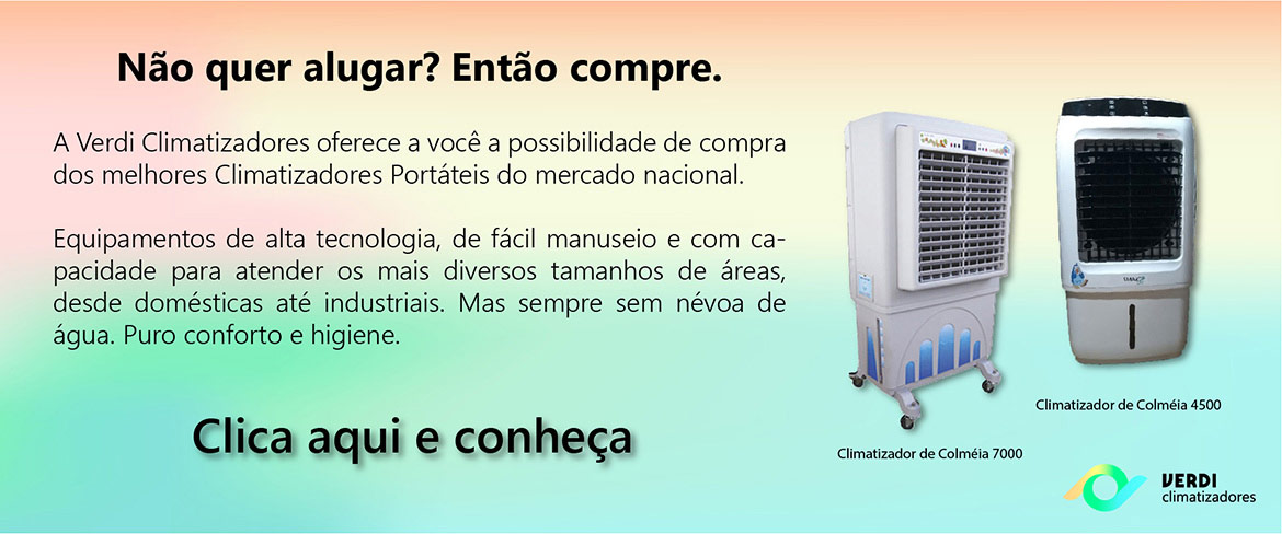 A área de Climatização da Verdi Equipos, aluga também outros modelos de equipamentos para climatização de seus ambientes. Cada um deles tem uma função e aplicações específicas. Consulte nossos consultores e descubra qual o melhor equipamento de climatização para sua necessidade.